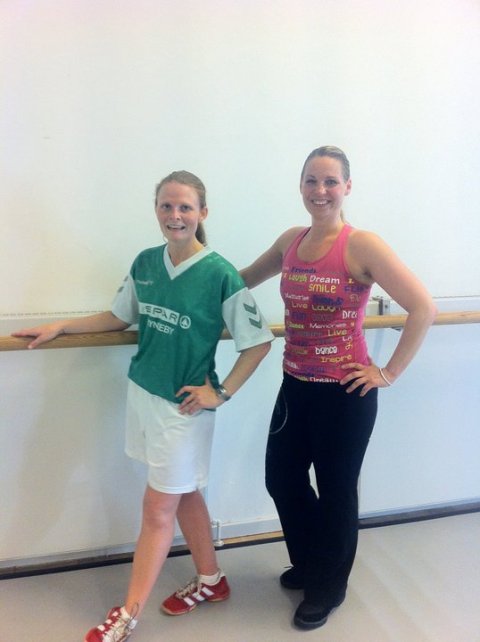 Louise og træt brud (Mette) efter et ZUMBA polterabend |  ZUMBA polterabend - Party fredag aften |  Mavedans polterabend - Louise danser med bruden (Sara) for sine gæster til sidst | | | |